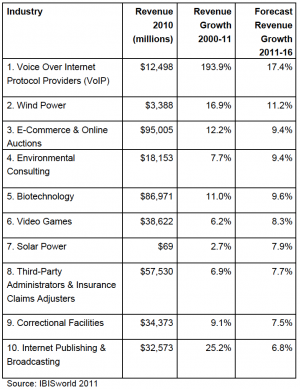 “After compiling the list of fastest growing industries, there were some apparent trends,” explained IBISWorld Senior Analyst Casey Thormahlen. “Each industry on the list experienced growth as a result of one or more of four drivers: Internet growth, environmental issues, cost cutting and evolving technology.”