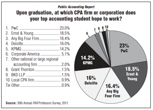 Public Accounting Report’s 30th annual poll of college accounting professors shows that if their best student had a choice, that student would choose PricewaterhouseCoopers to start their career.
