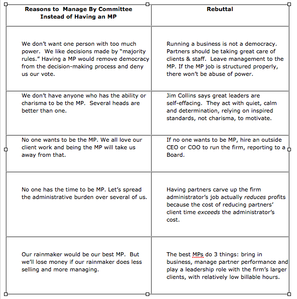 The absence of leadership is equally dramatic. Without leadership, organizations move too slowly, stagnate, and lose their way. Much of the literature about organizations stresses decision-making and implies that if decision-making is timely, complete, and correct, then things will go well. Yet a decision by itself changes nothing. After a decision is made, an organization faces the problem of implementation—how to get things done in a timely and effective way. Problems of implementation are really issues about how leaders influence behavior, change the course of events, and overcome resistance. Leadership is crucial in implementing decisions successfully. Management by committee Most organizations find that management by committee is not a good way to efficiently run a business. CPA firms are no exception. Here is a chart listing various reasons partners give for preferring management by committee over a MP, and a rebuttal for each reason: