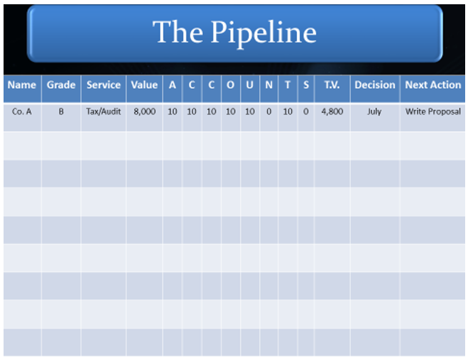A true pipeline grades prospects, works out the value of each prospect and determines where they should fit in your business development efforts. You can use this process to create a mathematical equation that scores how likely you are to win the work.
