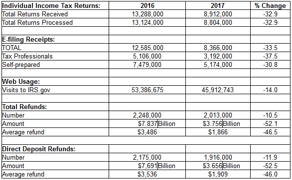 Of course, since it comes from the IRS, it also has its own set of footnotes and qualifiers. For one, even though we’re comparing the week ending Jan. 27, 2017, with the week ending Jan. 29, 2016, the 2016 figure included four more days of tax return processing – although when comparing identical numbers of days, 2017 marks an increase. For another, the new law requiring a hold on refunds involving the Earned Income Tax Credit and Additional Child Tax Credit until Feb. 15 is skewing early season refund numbers and dollar amounts, because many taxpayers claiming these credits are early filers.