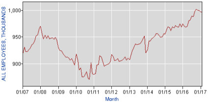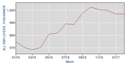 Overall employment in the profession stands at 996,900, down 100 jobs or statistically flat for the month, but is up 26,700 or 2.8 percent from the previous year.