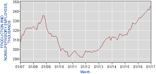These employees work an average 35.7 hours per week, up half an hour or 1.4 percent for the month but down 6 minutes or 0.3 percent for the year. Their hourly earnings average $31.34, up 14 cents for the month and 31 cents for the year, 0.4 and 1 percent respectively.