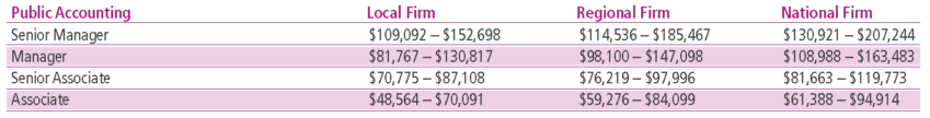 The survey presents salaries for 48 areas and levels of the profession, from accounting clerk and bookkeeper through controller and CFO. Generally, the survey does not isolate salaries by the size of the company. But in public accountancy, it separates out the salaries for local, regional, and national firms. It finds that the larger the firm, the higher the salaries of everyone from associate to senior manager.
