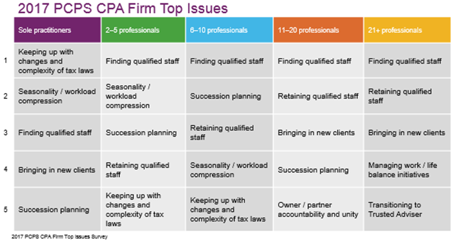 “Finding qualified staff” was the No. 1 issue in every firm-size segment except sole practitioners, where it ranked No. 3, according to the 2017 CPA Firm Top Issues Survey, sponsored by the AICPA’s firm practice management section. Likewise, “retaining qualified staff” was a Top 5 issue in every grouping except sole practitioners. Recruitment and retention were leading concerns the last time the survey was conducted in 2015, too, but the challenge appears steeper as the profession continues to gain strength in a growing economy.