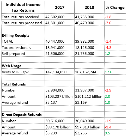 Total refunds issued numbered 31.9 million, down 2.9 percent. The total amount of $101.2 billion was up 2 percent, and the average refund of $3,169 was up 1 percent.