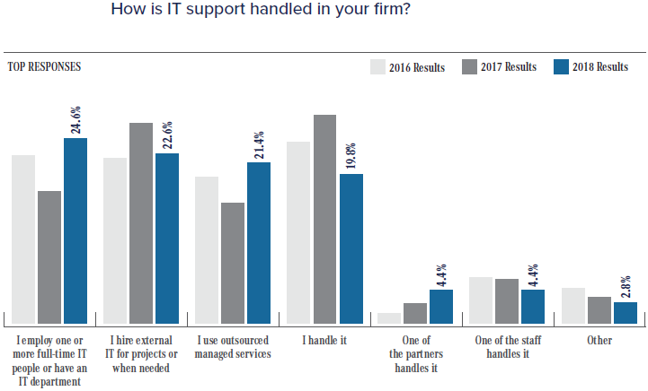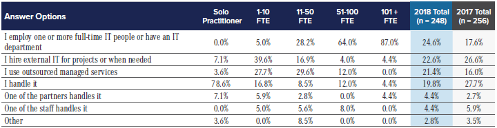 Trend Watch: Larger firms have generally found keeping IT people in-house to be beneficial. The complexity has made it harder for solo practitioners to handle.
