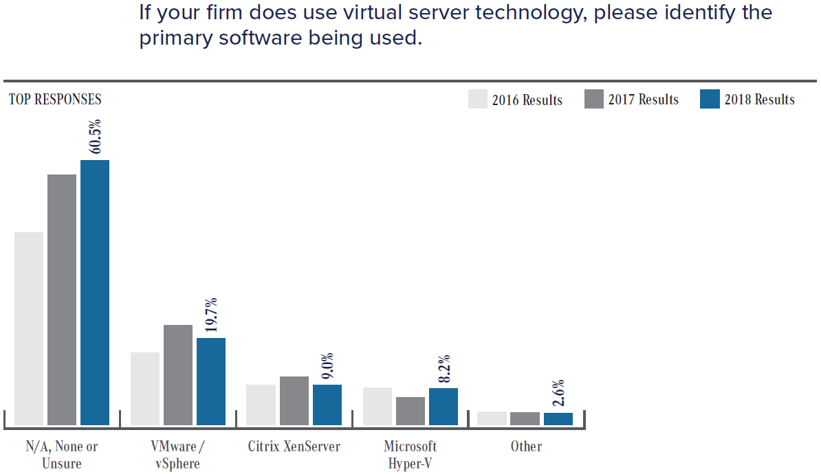 CHARTS & GRAPHS SURVEY: CPAs’ Favorite Virtual Servers Trend Watch: VMware, Citrix, and Microsoft compete for accounting firms. By Accounting Firm Operations and Technology Survey Related Posts PE Deal Tracker Update: Alan Whitman Plants a Flag in the Private Equity Landscape Weak Business Models Exposed | Gear Up For Growth Bot Wars: Wolters Kluwer, Intuit, Thomson Reuters Battle for AI Dominance in CPA Firms | Cornerstone Report Outlook 2026: Agentic AI Reaches the Tipping Point in Tax and Accounting Firms Lewis: Workforce Development Is the Next Imperative | Gear Up For Growth Posted on May 9, 2019
