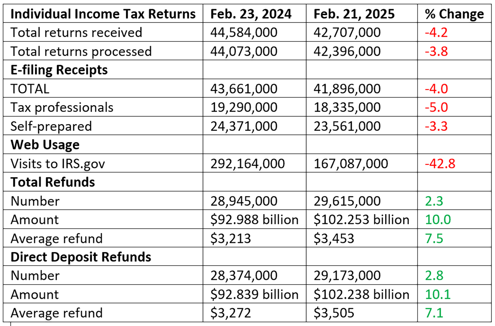 For the first time this busy season, the IRS is reporting not just refund numbers and average amounts but also the total amounts refunded. It’s good news: up 10 percent for both total and direct deposit refunds.