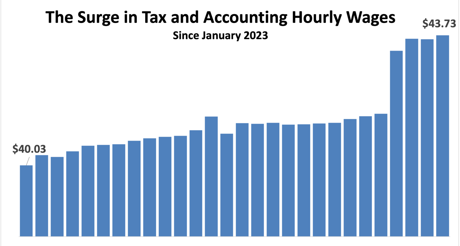 Average hourly earnings in the tax and accounting sector are surging at a 6.1 percent year-over-year rate – faster than the overall inflation rate and outpacing price growth, setting up a new squeeze on profit margins.