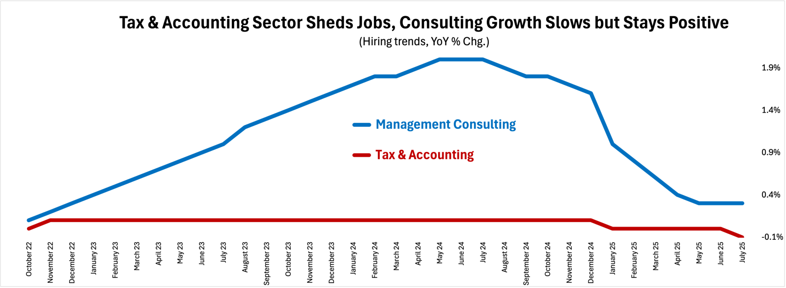 Hiring in the management consulting sector slows, but remains positive. Tax & accounting sector shrinks workforce.