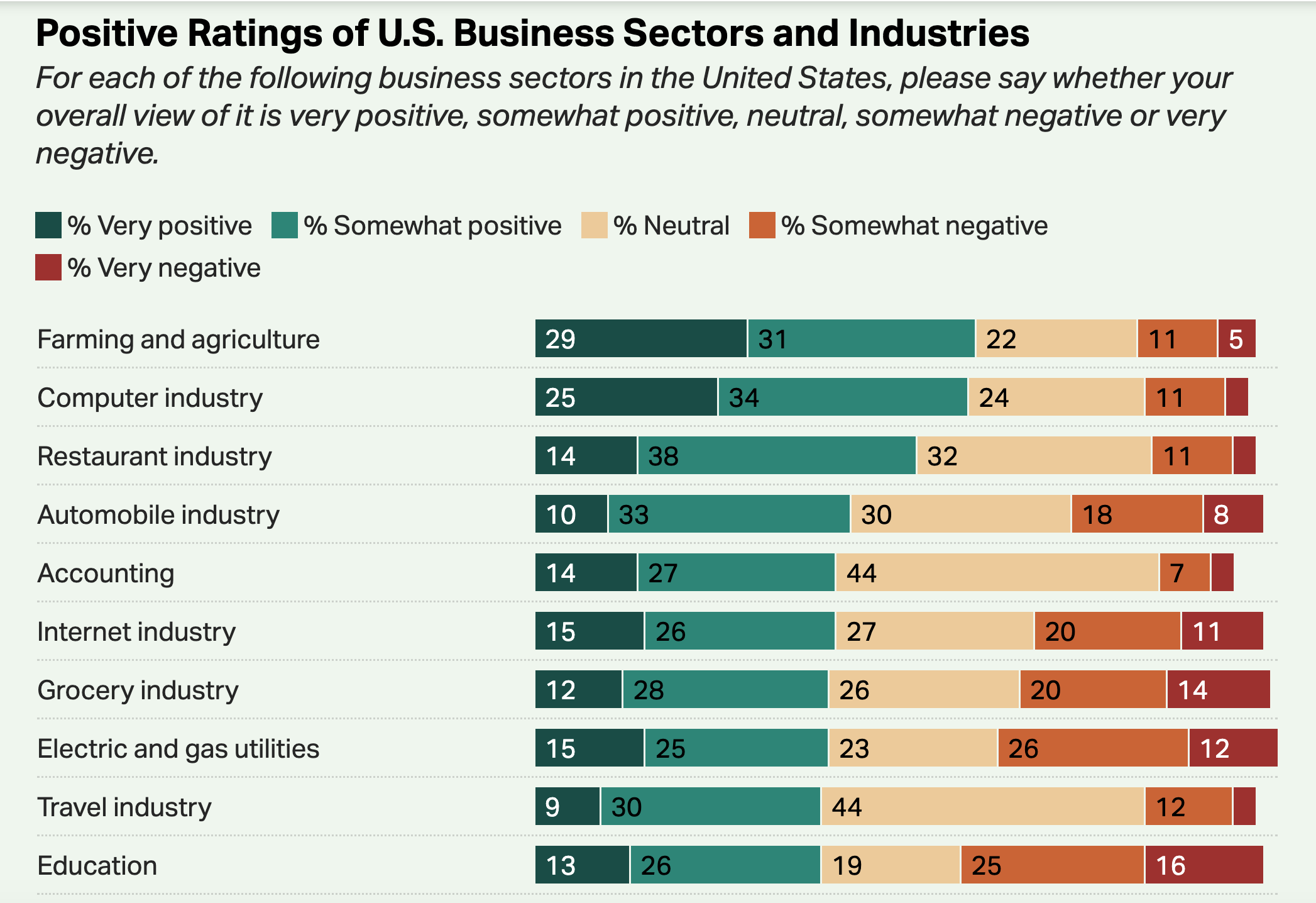 The findings show accounting with 41% of adults holding a positive view, reflecting modest but stable standing amid generally weak perceptions of U.S. business sectors.