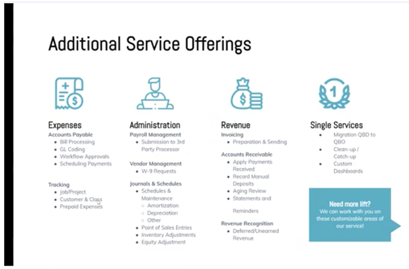 Services you offer in addition to your tiered service packages are one-off services clients occasionally need in addition to their monthly and recurring services. These services are sold to the client as a solution to a problem and as a separate engagement, and they are ideal for letting your client know the full breadth of your offerings. If you see in their business financials an area where they’d benefit from one of your services, absolutely let them know. The client may not buy the service immediately, but perhaps a few months down the road they will circle back and continue the conversation.