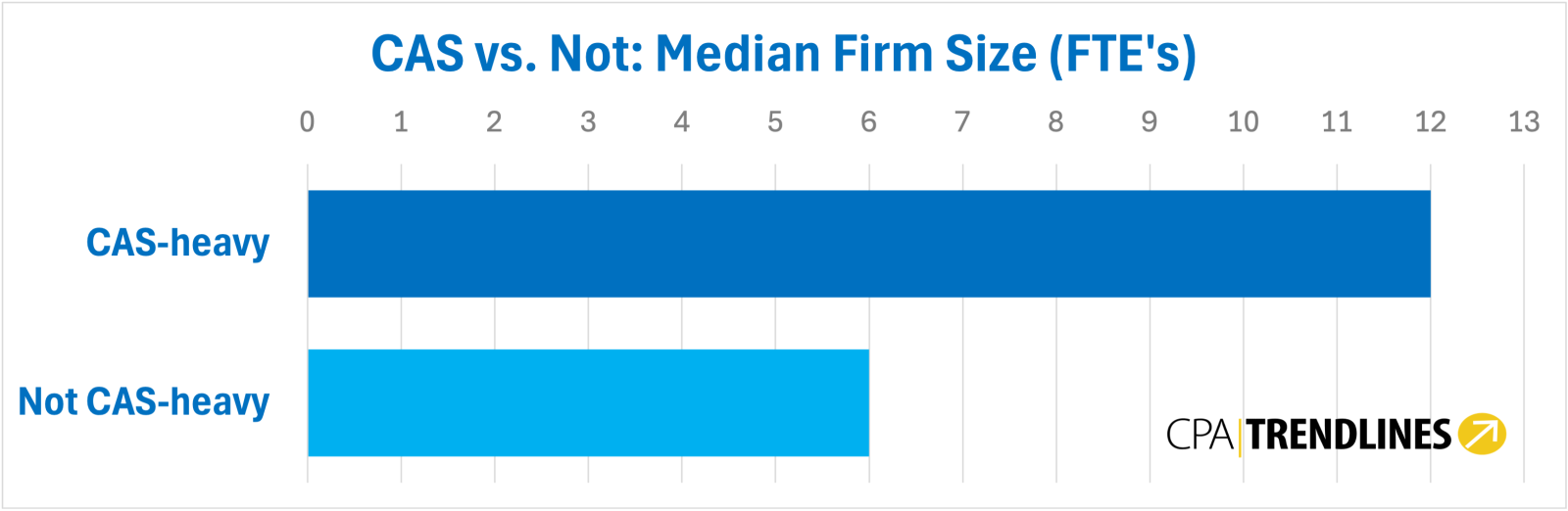CAS-heavy firms also skew larger in staffing. The median firm-size midpoint is 12 people for CAS-heavy firms, versus 6 for non-CAS-heavy firms.