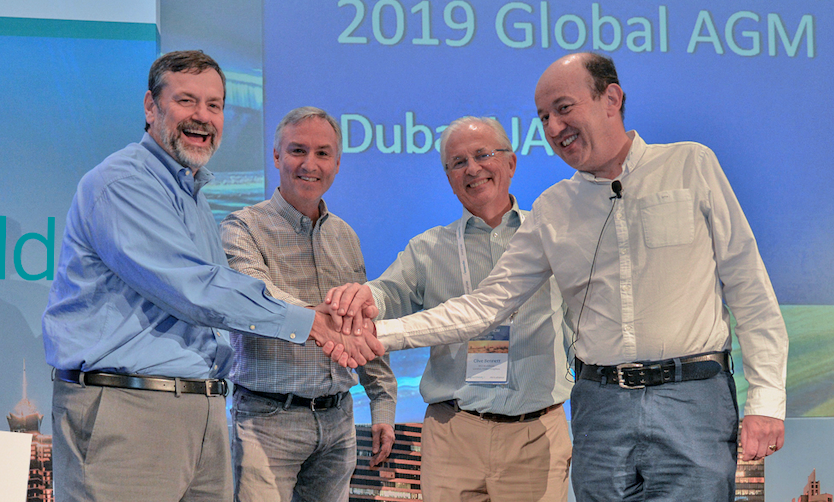 Left to right: Jim Holmes, International Chairman of CPAAI; Michael Parness, President of CPAAI; Clive Viegas Bennett, CEO of MGI Worldwide, and Roger Isaacs, Chairman of MGI Worldwide, celebrating the merger agreement at MGI Worldwide’s Annual Global Meeting in Dubai, UAE.